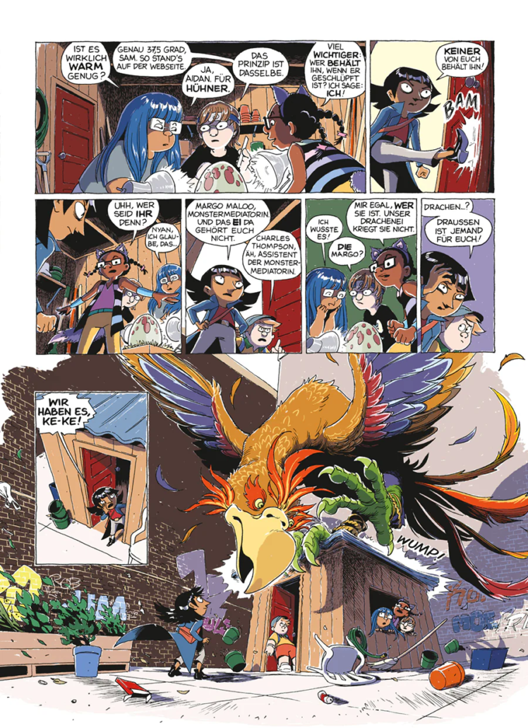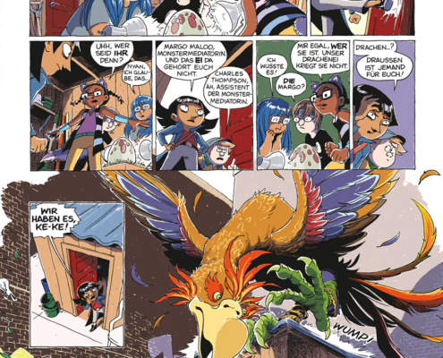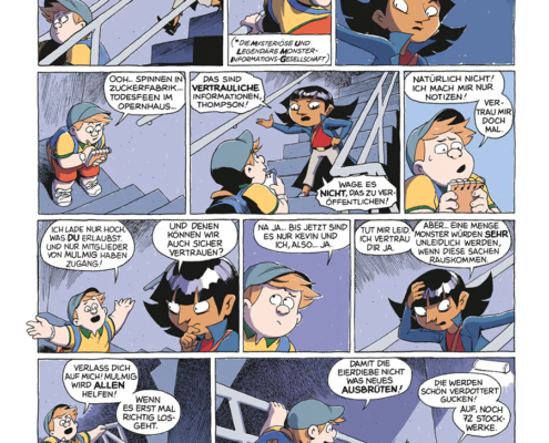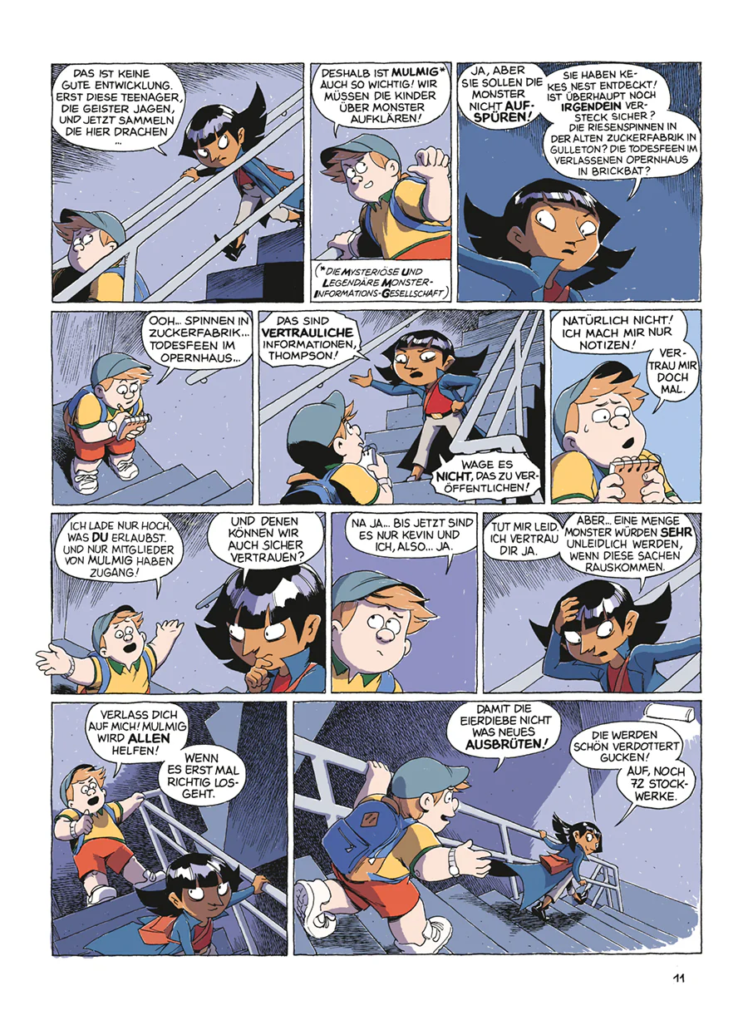 Der dritte Band wird übrigens mit einem kleinen, aber sehr schönen Detail eröffnet: einem Blogeintrag von Charles Thompson auf dem streng geheimen M.U.L.M.I.G.-Blog. M.U.L.M.I.G. steht für Mysteriöse und Legendäre Monster-Informations-Gesellschaft – eine Art Monster-Wikipedia für Kinder. Dort werden Kreaturen beschrieben, ihre Eigenheiten erklärt und manchmal auch Hinweise gegeben, ob man ihnen besser aus dem Weg gehen sollte oder ob sie vielleicht sogar freundlich sind. Gerade wenn man diese Welt einmal am Spieltisch erlebbar machen möchte, ist das ein hervorragender Ansatz. Statt die Kinder nur die Figuren aus dem Comic begleiten zu lassen, könnten sie ihre eigenen Monsterforscher oder Monstervermittler spielen – mit eigenen Einträgen im M.U.L.M.I.G.-Archiv.